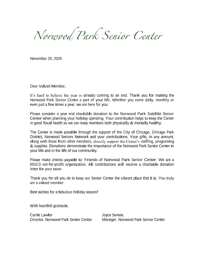 Finally, I want to close with our annual holiday appeal which kicks off on 12/2, Giving Tuesday. I have attached the letter in this email but we will be passing out hard copies to all who come to the Center. I have already received hundreds in early donations which is amazing. Thank you so much to those who have already given & those intending to give in the upcoming weeks. Any amount is appreciated.