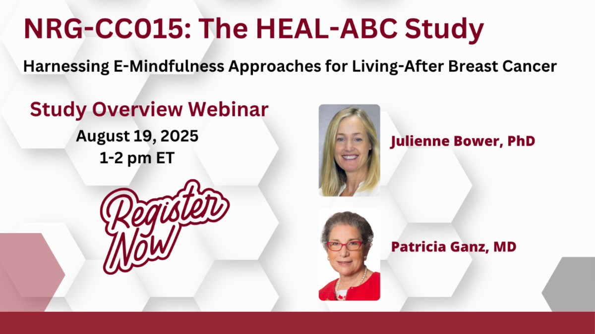 The NRG-CC015 study team will be hosting a webinar on August 19, 2025, 1–2 pm ET to provide an overview of the trial, Harnessing E-Mindfulness Approaches for Living-After Breast Cancer (HEAL-ABC).