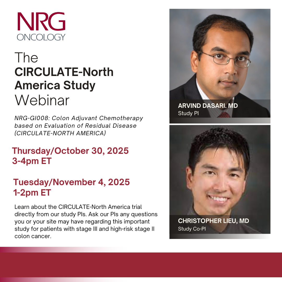 Lieu CH, Yu G, Kopetz S, Jacobs SA, Lucas PC, Sahin IH, Deming DA, Philip PA, Hong TS, Rojas-Khalil Y, Loree J, Wolmark N, Yothers G, George TJ, Dasari A. NRG-GI008: Colon adjuvant chemotherapy based on evaluation of residual disease (CIRCULATE-NORTH AMERICA). ASCO GI; January 8-10, 2026. Poster Session, 1/10/2026; Abstract # TPS256.