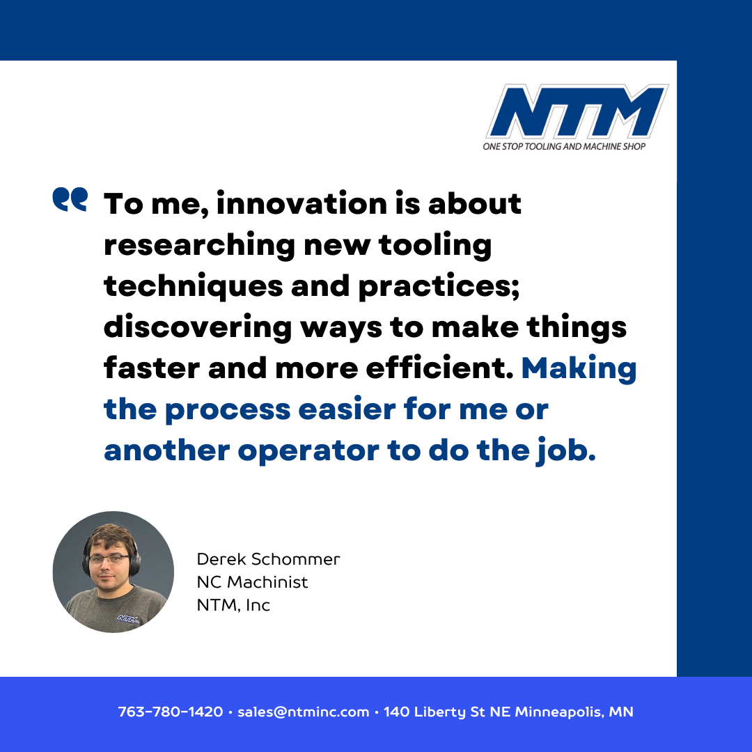 At NTM, innovation is at the heart of everything we do. We recently sat down with Derek Schommer, one of our seasoned NC Machinists, to learn why innovation is so crucial in manufacturing. With nearly 8 years at NTM—and a trusty 3D printer by his side—Derek embodies our commitment to exploring new technologies that drive efficiency and quality.