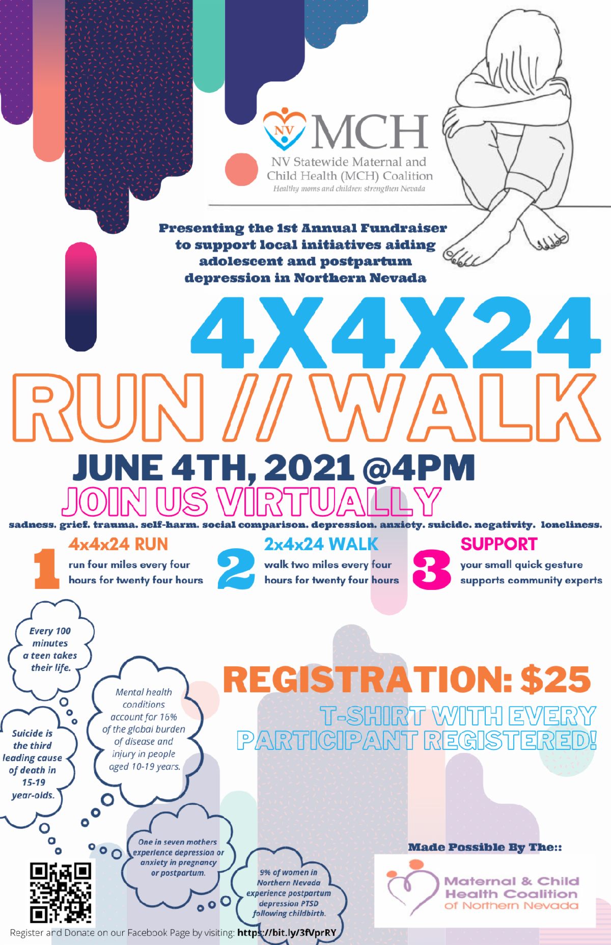The Northern Nevada Maternal and Child Health Coalition is proud to present its 1st Annual Fundraiser to support local initiatives aiding adolescent and postpartum depression in Northern Nevada. Run for awareness! There will be two options for participants. Participants can either Run 4 miles every 4 hours for 24 hours or walk 2 miles every 4 hours for 24 hours. All proceeds will be split equally between adolescent and postpartum depression in our community. Registration is $25.00 and all registered participants will receive a t-shirt.