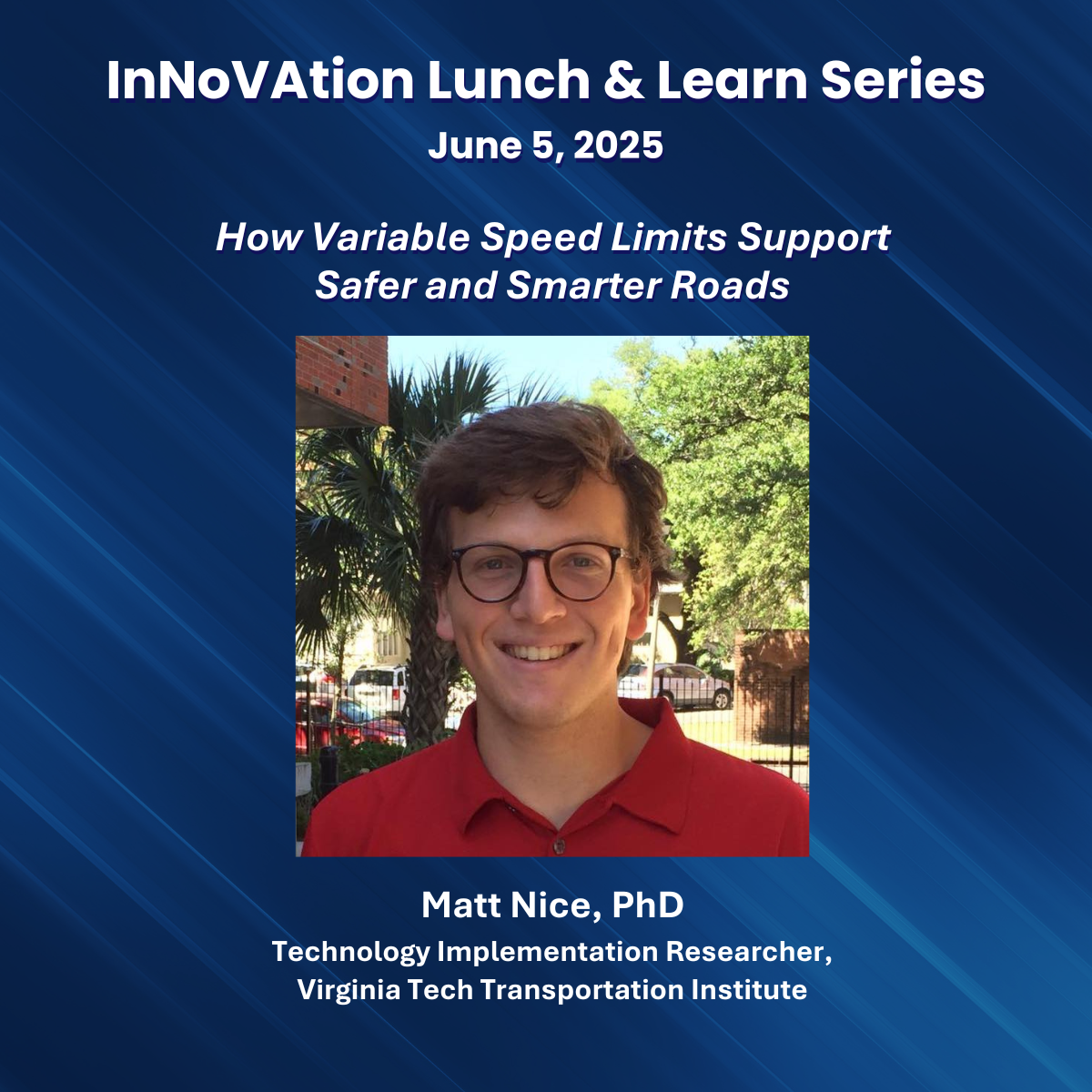 Join us for our first InNoVation Lunch & Learn of the season on Thursday, June 5th, at 12:00 p.m.! Matthew Nice, a technology implementation researcher at the Virginia Tech Transportation Institute, will highlight early impacts from variable speed limit projects across the U.S. and implications for improving the safety and efficiency of transportation networks.