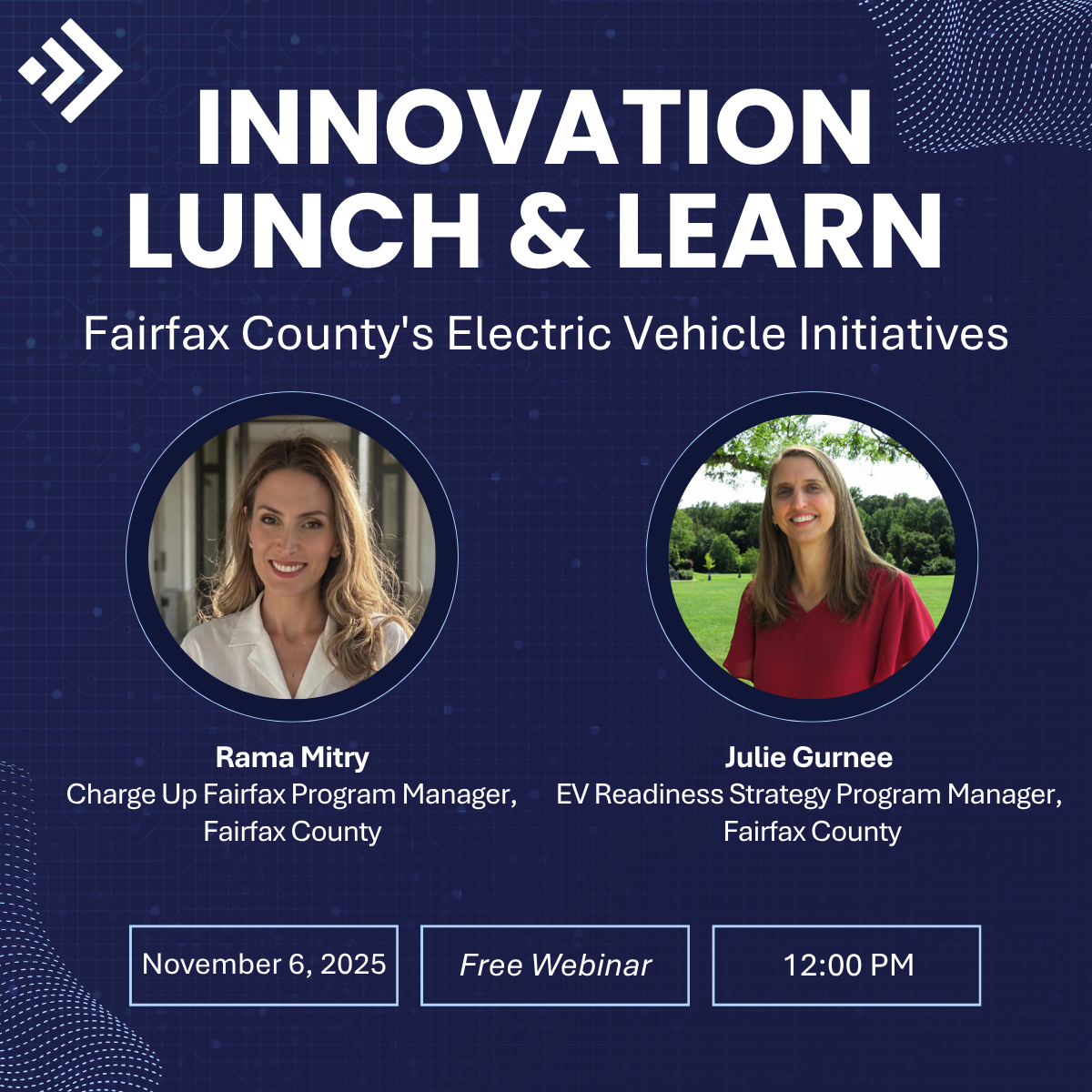Join us for our next InNoVation Lunch & Learn on Thursday, November 6, at 12:00 p.m.! Rama Mitry, Charge Up Fairfax Program Manager, Fairfax County, and Julie Gurnee, EV Readiness Strategy Program Manager, Fairfax County, will discuss how countywide programs such as Charge Up Fairfax are shaping EV readiness, the future of sustainable mobility in Northern Virginia. We look forward to seeing you there!