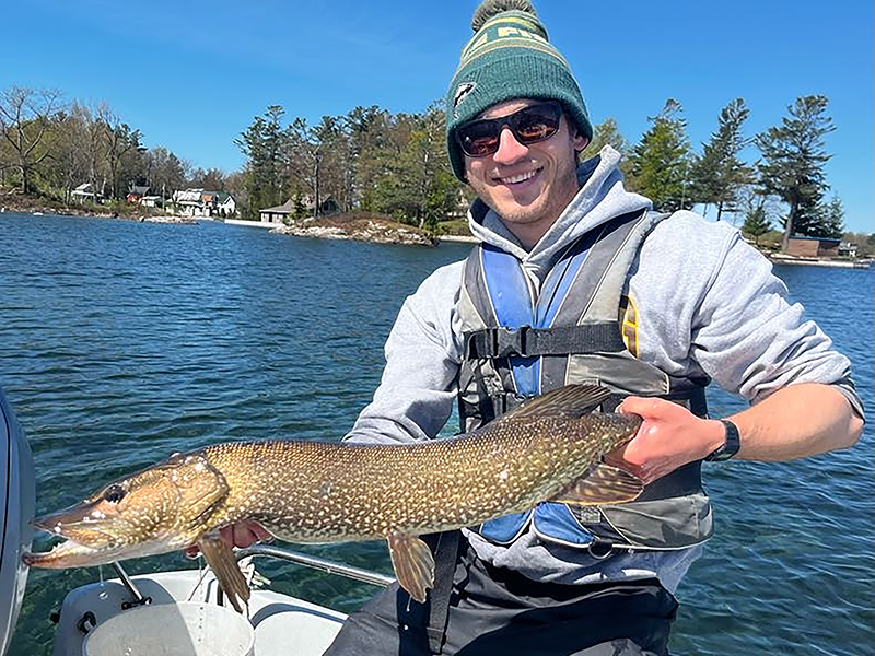 SUNY ESF graduate student Ben Spitz holds an adult northern pike captured in annual netting surveys by the Thousand Islands Biological Station in NY. Credit: Emily Arsenault