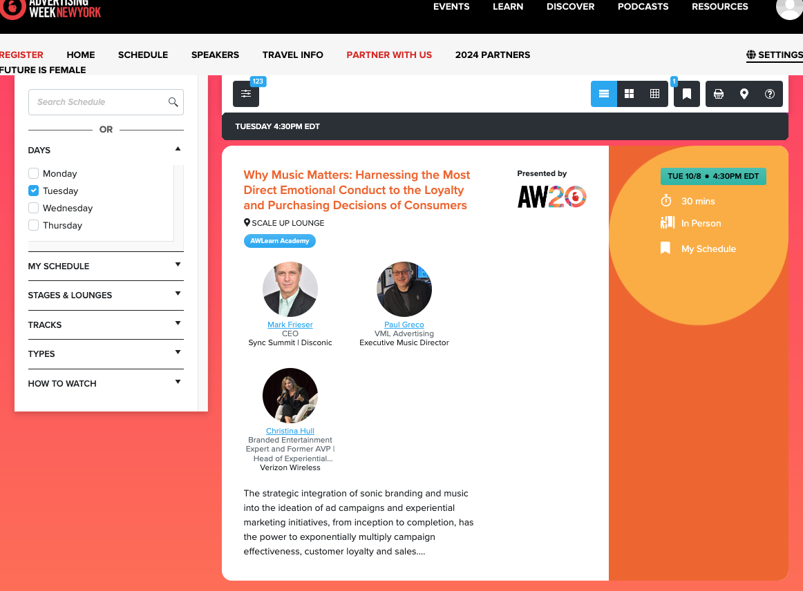 If you want to join us at the NY Sync Summit, until October 11, you can sign up to attend virtually or in person at deeply discounted rates ($400 off in-person tickets and $250 off virtual tickets) by going to this page: