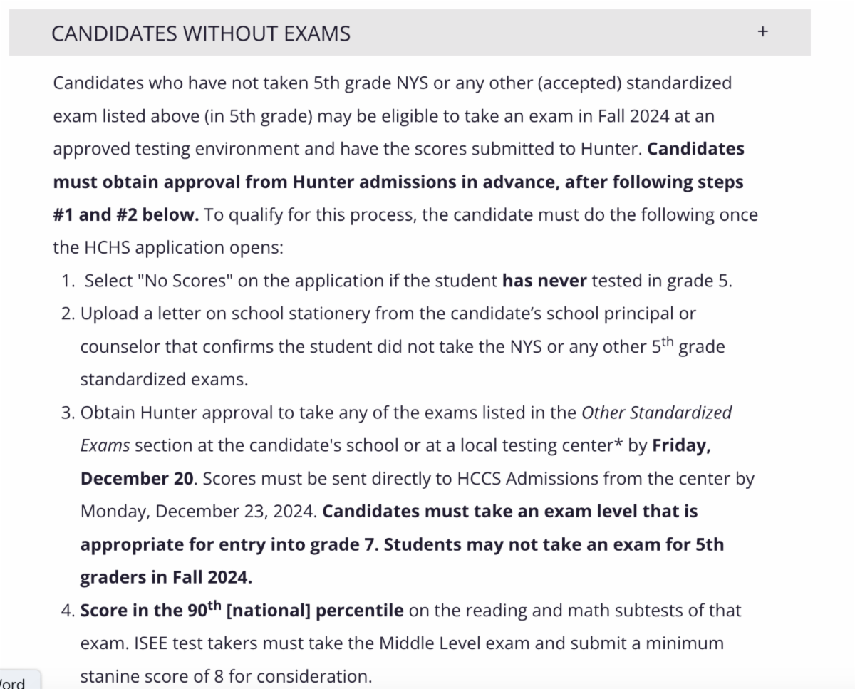 These students will be notified that they can take the January 24, 2025, Hunter test by January 10, 2025. They can apply for the Hunter test on the HCHS Website starting Friday, November 8, 2026. Remember, only students who scored 474+ in ELA and 496+ in math can complete the Standard Application.