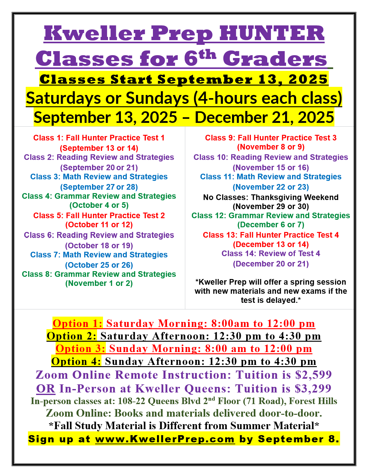Please email us at info@KwellerPrep.com if you do not have any 5th-grade state test scores and are interested in taking the Hunter Test.