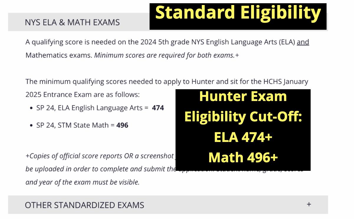 If you did not meet the 5th-grade state exam score cut-off, please keep reading below (purple text) for a brand new opportunity to apply to take the Hunter test with lower state scores (465+ ELA and 488+ Math).