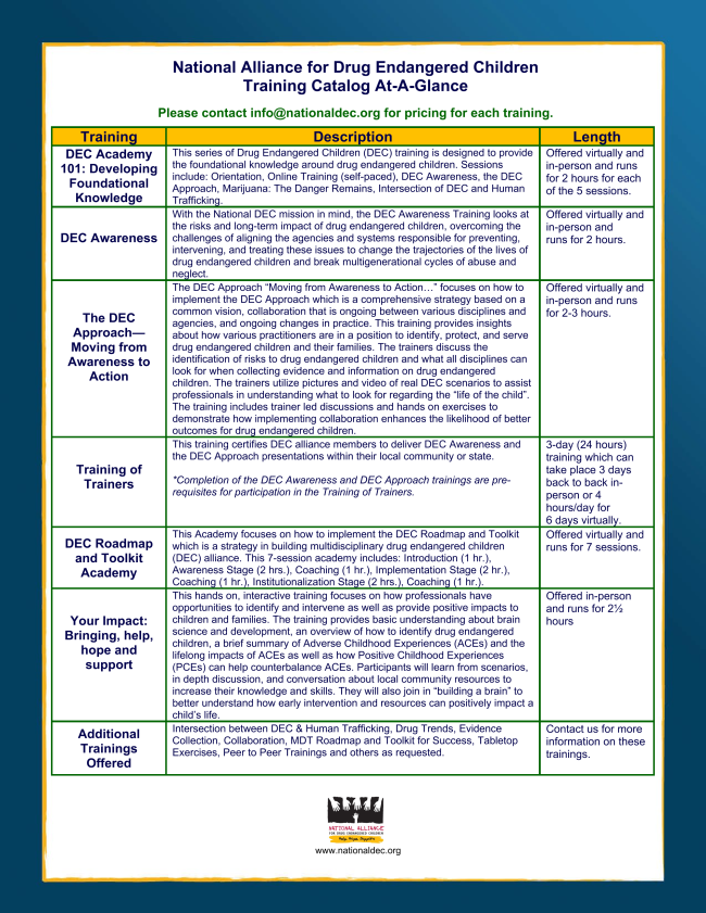 As more funding opportunities continue to open consider including National Alliance for Drug Endangered Children (NADEC) training and support in your grant proposals.