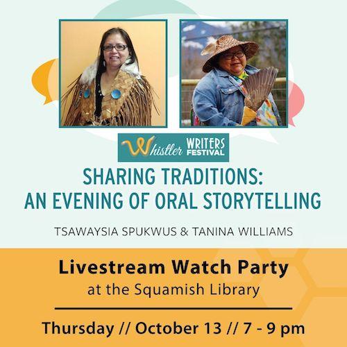 The Whistler Writers Festival celebrates the art and tradition of oral storytelling featuring the talents of Tanina Williams (Lil’wat Nation) and Tsawaysia Spukwus (Squamish Nation).
