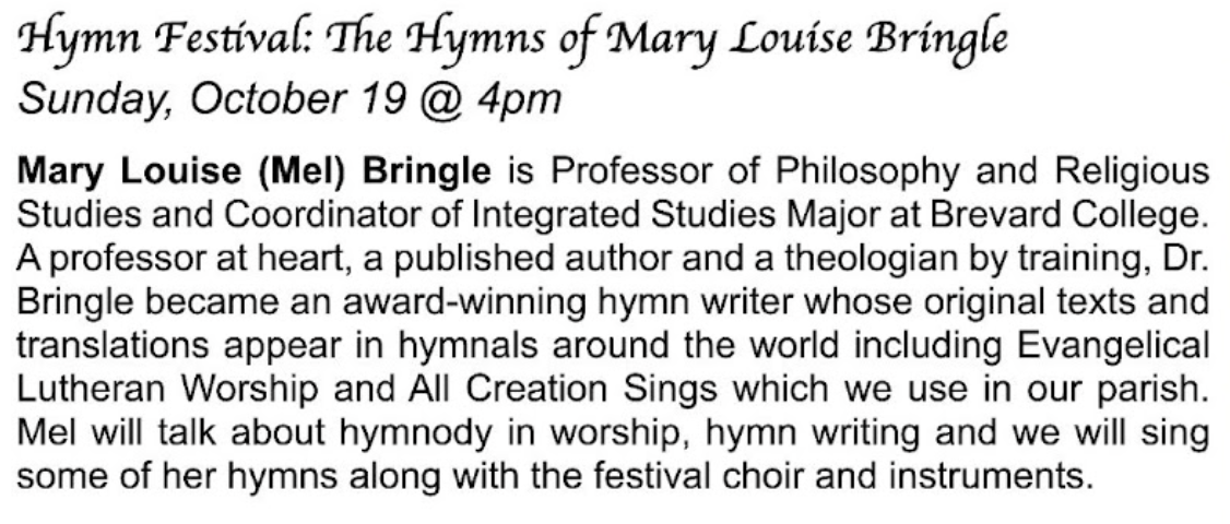 Our friends at St. Mark's Lutheran Church in Asheville (10 North Liberty Street) have invited us to a concert by the "Smoky Mountain Brass Band" on Sunday, October 26 at 3pm. This is Asheville's British-style Brass Band. There is no cost.