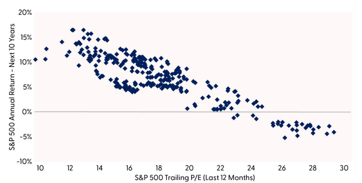 Valuations play a particularly critical role in this framework, as historically they have demonstrated a high correlation with long-term market performance. The price-to-earnings ratio (P/E) for the S&P 500 Index, for example, has shown predictive power for subsequent decade-long returns, with higher P/Es typically preceding weaker long-term performance and lower P/Es often followed by stronger results.