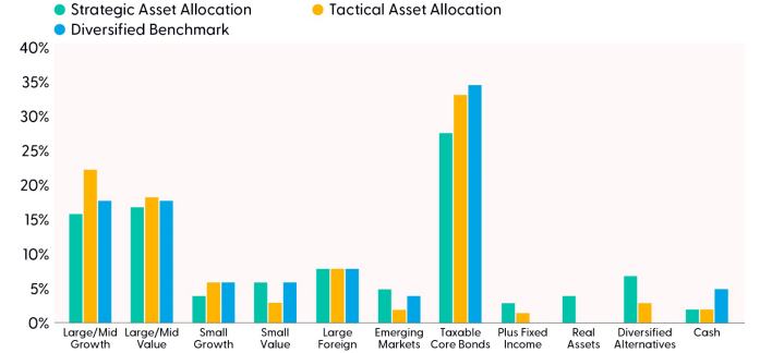 As such, we increased exposure to off-benchmark asset classes and diversifying strategies — real assets to hedge elevated inflation expectations over a long-term 3–5-year investment horizon via a diversified basket of commodities, global listed infrastructure, and short-duration Treasury Inflation- Protected Securities (TIPS). Alternative investments were also added to hedge potential volatility, and market concentration risks via a diversified basket of multi-strategy, global macro, and managed futures strategies.
