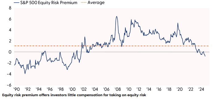 As a result of these strategic concerns in the recent SAA update, LPL Research reduced both portfolio risk and exposure to traditional asset classes. The risk-reward trade-off for both stocks and bonds has been challenged by a slow growth environment (relative to history), elevated inflation, and a "higher-for-longer" interest rate outlook. The expansion of equity multiples observed in 2024 further exacerbates this situation.