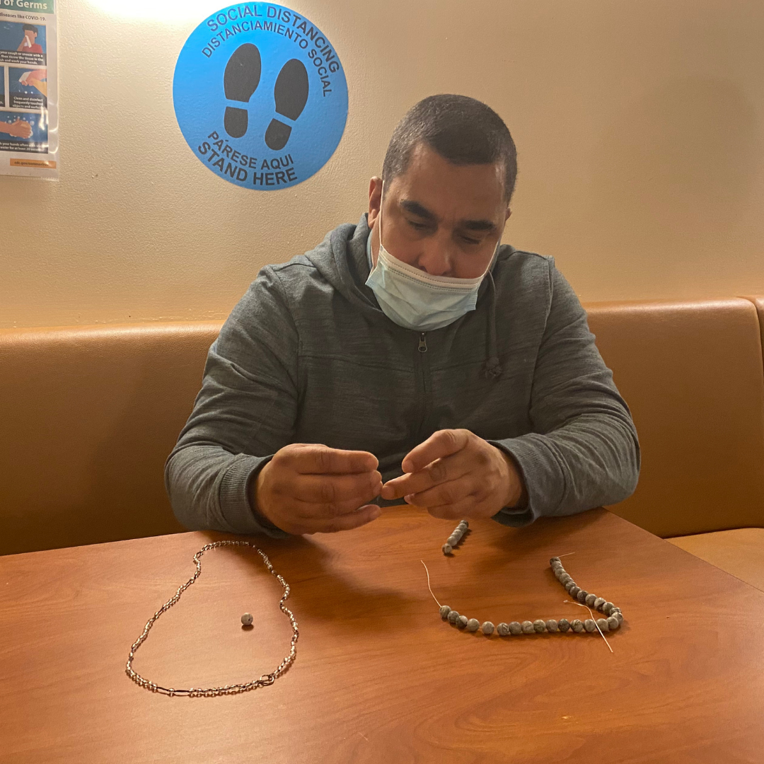Susan wasn't the only volunteer who recently returned to the NCS Residence- NCS volunteer Mary Jo Pane of Miracle Icons also paid a visit to teach a jewelry-making class. These events were a favorite of the tenants prior to COVID, and we are so happy Mary Jo was able to safely return to help create more beautiful pieces.