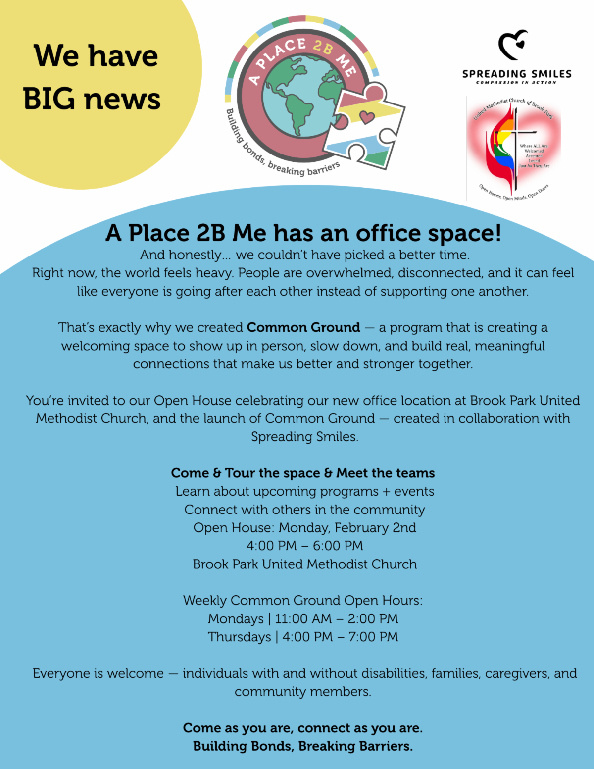 You're invited to our Open House celebrating our new office location at Brook Park United Methodist Church, and the launch of Common Ground - created in collaboration with Spreading Smiles.