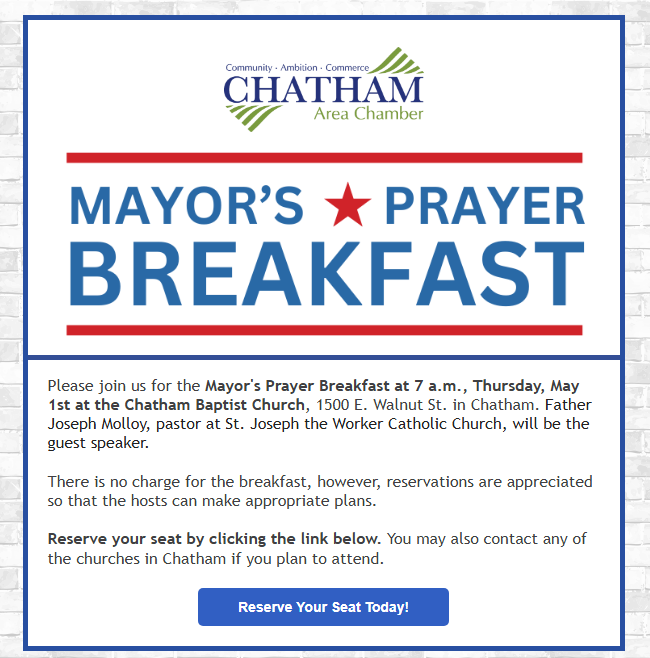 | | Register for Our Speed Networking Luncheon | | Chatham Mayor's Prayer Breakfast May 1st | | |