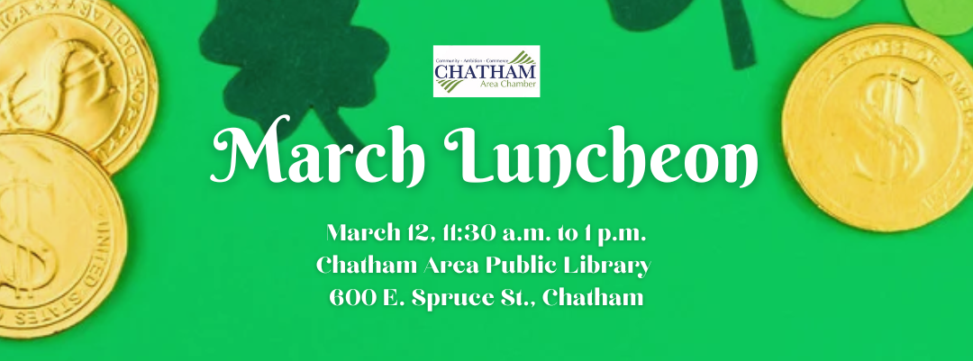 | | | Please note: If you register and your plans change, please notify the Chamber office as soon as possible by emailing coordinator@chatham-il-chamber.com since we must pay for every confirmed reservation. Please note that you will be billed for the cost of food if you do not cancel your reservation by the indicated RSVP deadline. | | Chatham Area Public Library, 600 E. Spruce St. in Chatham | | Chatham Chamber Scholarship Applications are Open! | | |