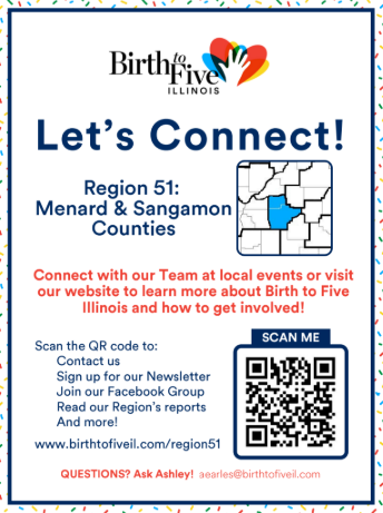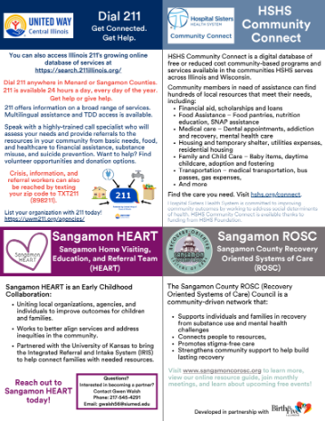 Birth to Five Illinois: Region 51 Team is excited to share our new Community Resource Directory flyers, created in partnership with Sangamon HEART, Sangamon County Recovery Oriented Systems of Care (ROSC), Hospital Sisters Health System (HSHS), and United Way’s 211!