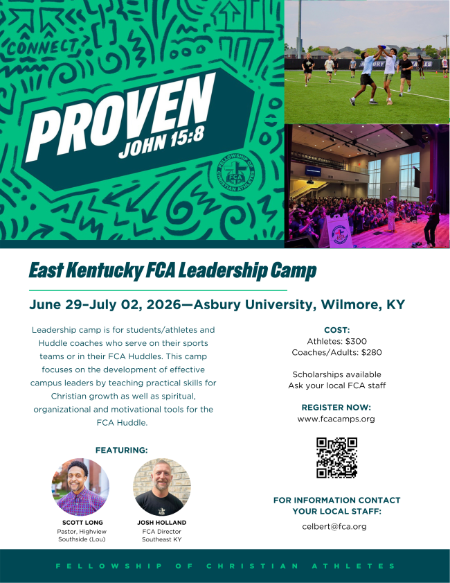 | | Kentucky East FCA Leadership Camp 2026 registration is now open! Click the button below to register, and come join us from June 29-July 2 at Asbury University! | | |