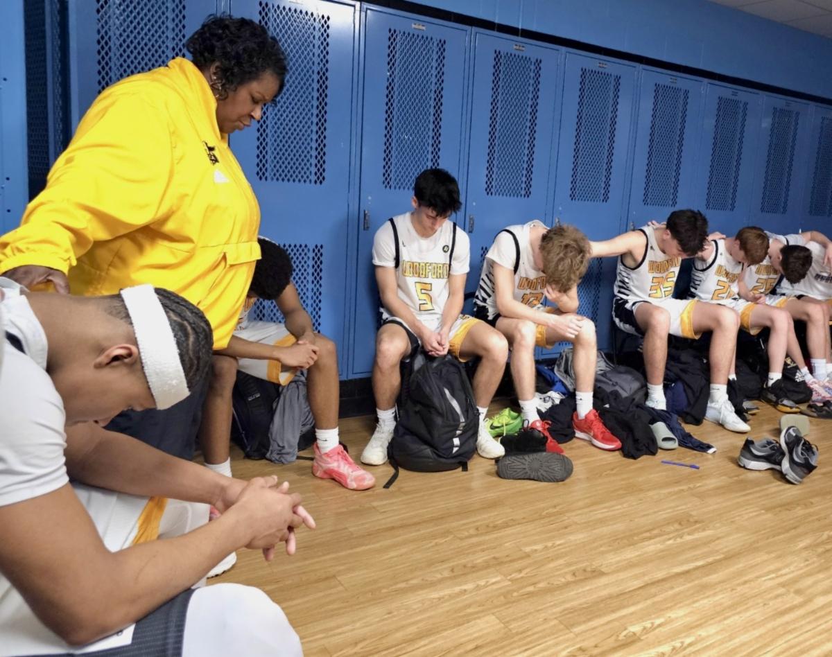Bug Brown, serves as the Character Coach for the boy's basketball team at one of her campuses--Woodford County High School. Pictured here is her praying over the team before the district championship game that they went on to win. Congratulations, team, we are proud of you! More importantly, we are proud of how you are seeking the Lord!