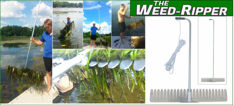 The only device that cuts and rips out lilypads by their roots and permanently gets rid of them. (Requires a boat)