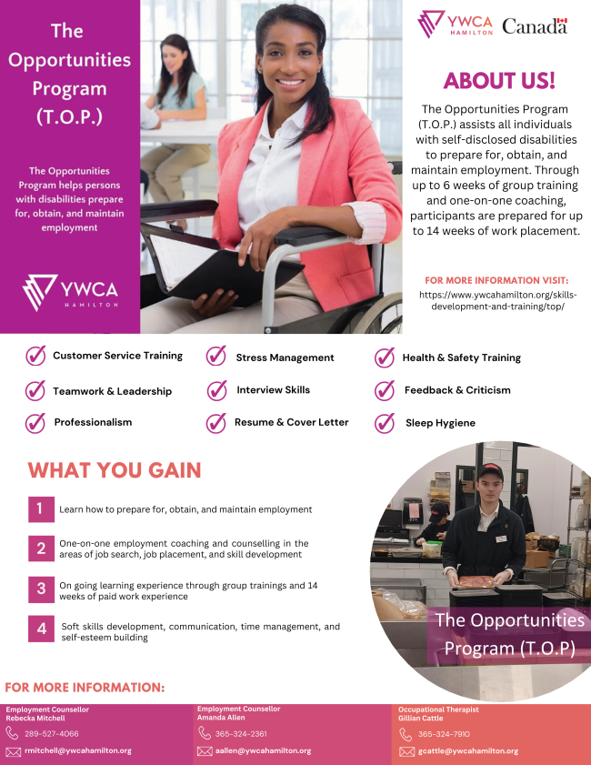 YWCA Hamilton TOP (The Opportunities Program) an employment program that assists folks in the community, all genders from ages 16 + with a self disclosed disability, to prepare, obtain, and maintain employment.