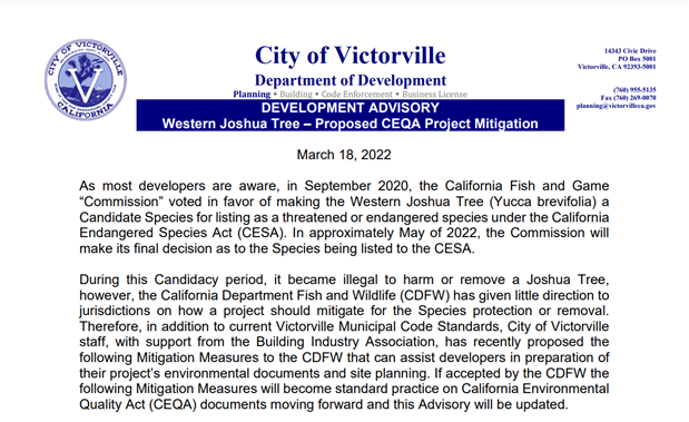 The City of Victorville has proposed mitigation measures for the Joshua Tree recommended in a BIA white paper. The City also submitted a joint letter to the California Department of Fish and Wildlife encouraging consideration of these mitigation options in the state permitting process (see attached letter).
