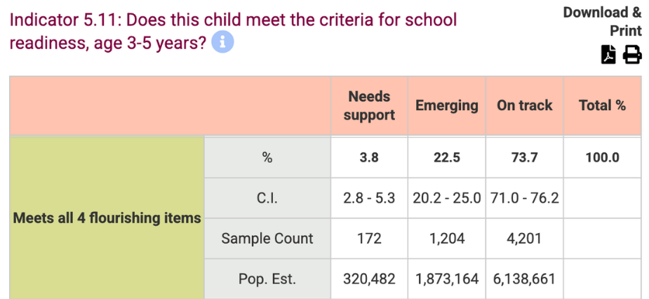Measures of school readiness and child flourishing provide critical insights into the early foundations that support children’s long-term health and well-being. Using the DRC Interactive Data Query (IDQ) subgroup feature, users can explore how these measures relate to one another and what they reveal about early childhood development in the United States. The NSCH data illustrates a strong relationship between these measures with higher levels of flourishing associated with higher degrees of school readiness. These findings highlight the importance of nurturing children’s social, emotional, and developmental strengths in the early years to support readiness for school and lifelong well-being.