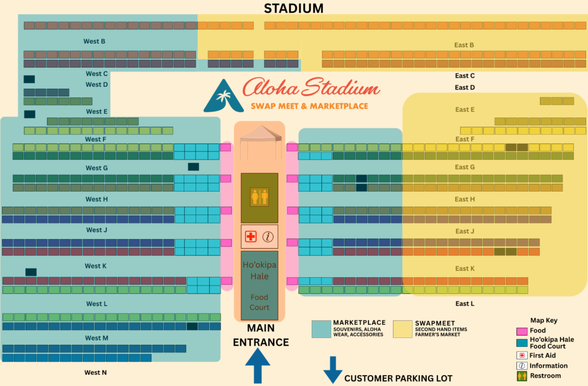 The Aloha Stadium Swap Meet & Marketplace — Hawai‘i’s largest open-air market — has officially relocated to its new home in the Upper Hālawa Lot, and this month we’re excited to launch our new Vendor Directory to help shoppers easily find their favorite vendors. The Swap Meet is now conveniently arranged in two distinct areas: the Marketplace section, shown in blue on the map, featuring souvenirs, aloha wear, and accessories; and the Swap Meet section, shown in orange, offering secondhand finds and farmers market items.
