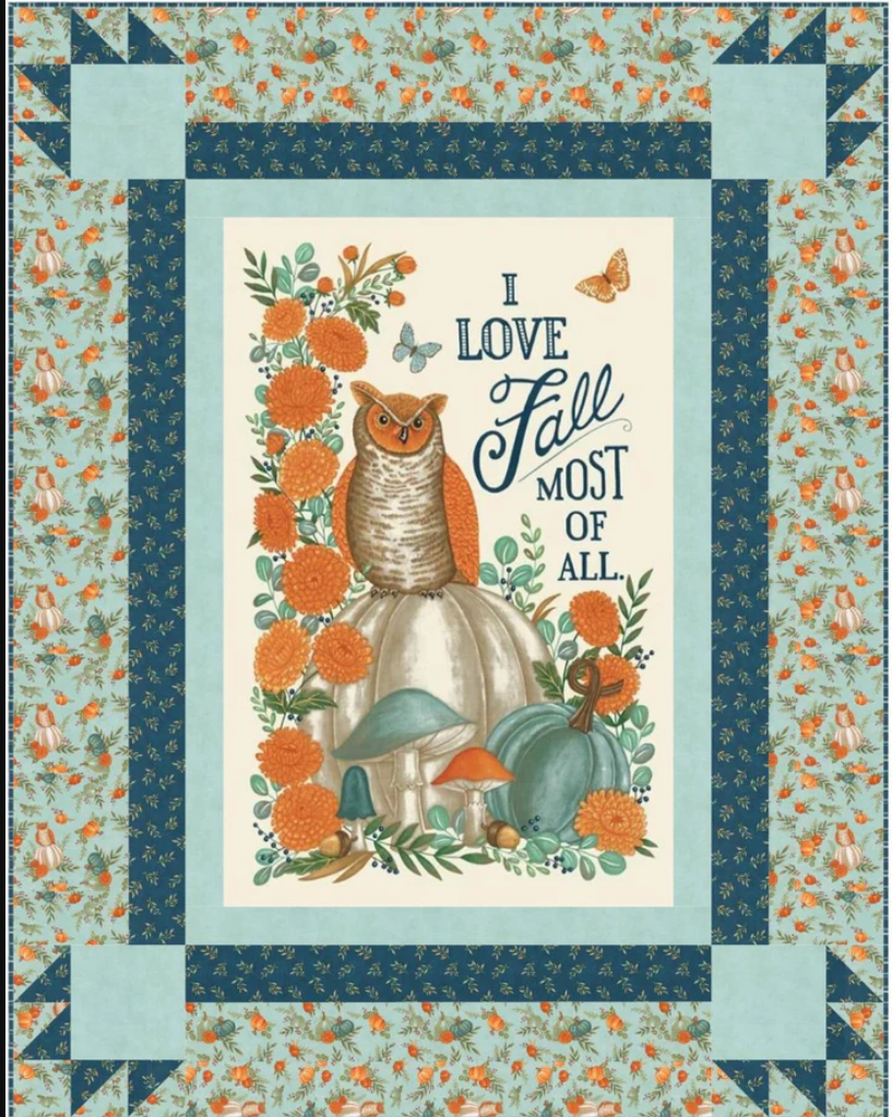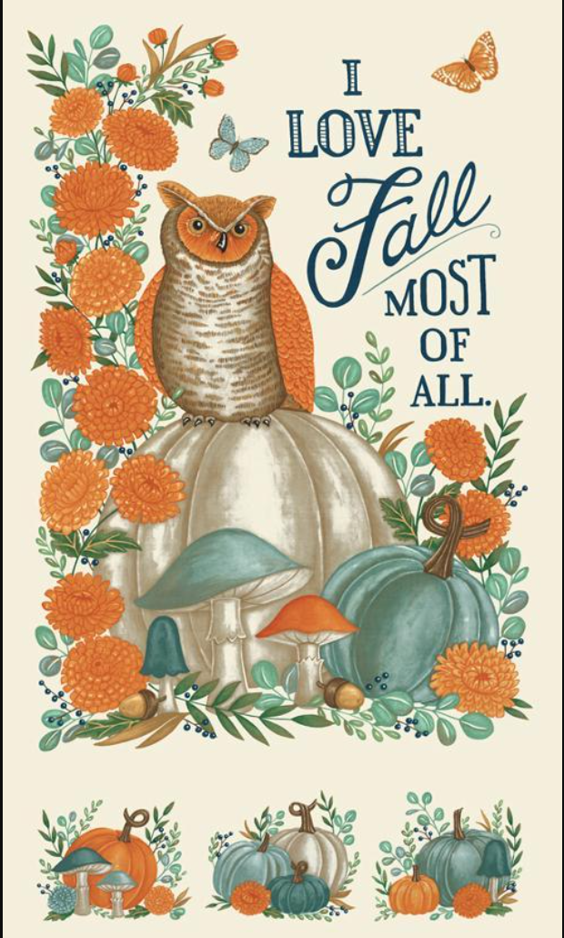 The panel features a wise and serious owl and the declaration of “I Love Fall Most of All”. Will you frame the full size panel as it is and use as a wall hanging, and make some matching placemats or a table runner with precuts & yardage?…
