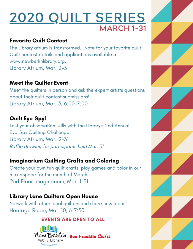 Visit the Library the month of March as we celebrate National Quilting Month with our Annual Quilt Display Voting Contest and "Find the Quilt" Challenge. Quilt-inspired games and crafts will also be available in the Library's 2nd floor Imaginarium.