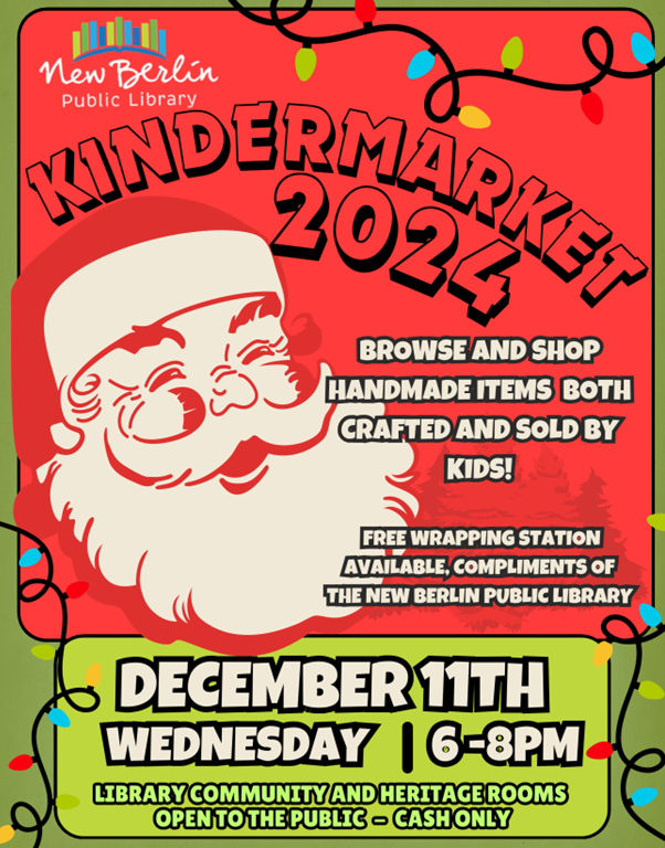 The 2nd Annual KinderMarket features handmade items crafted and sold by kids, and is open to the public in the Community Room with no registration required. Enjoy cash-only shopping and a free gift wrapping station, courtesy of the New Berlin Public Library! | |