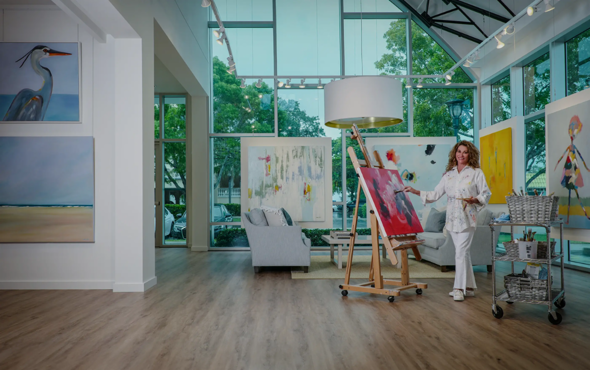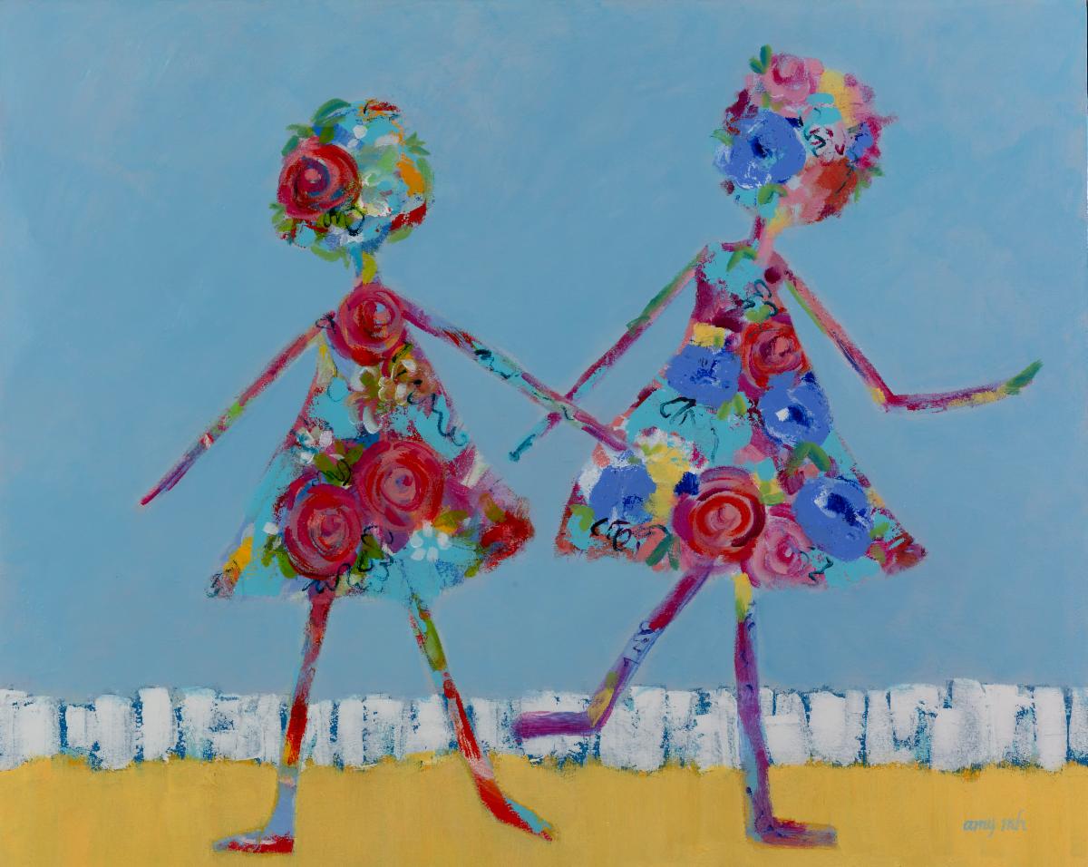 Amy Art Gallery + Studio is owned by artist Amy Moglia Heuerman. The gallery exhibits Heuerman’s paintings in a variety of genres – abstract, coastal, and her celebrated series of “The Girls,” paintings that feature faceless figures in dancing movements against Heuerman’s signature layered backgrounds. The gallery is an elegant, loft-like space bathed in light streaming through soaring, double-height wraparound windows. There are several areas of exhibit space featuring Heuerman’s artwork, a reception area, working studio space, and salon style seating. |