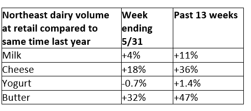 The sales increase at retail is slowing as quick serve restaurants and sit-down restaurants begin to reopen. Milk sales are up 4% as of May 31, and 11% over the past 13 weeks.
