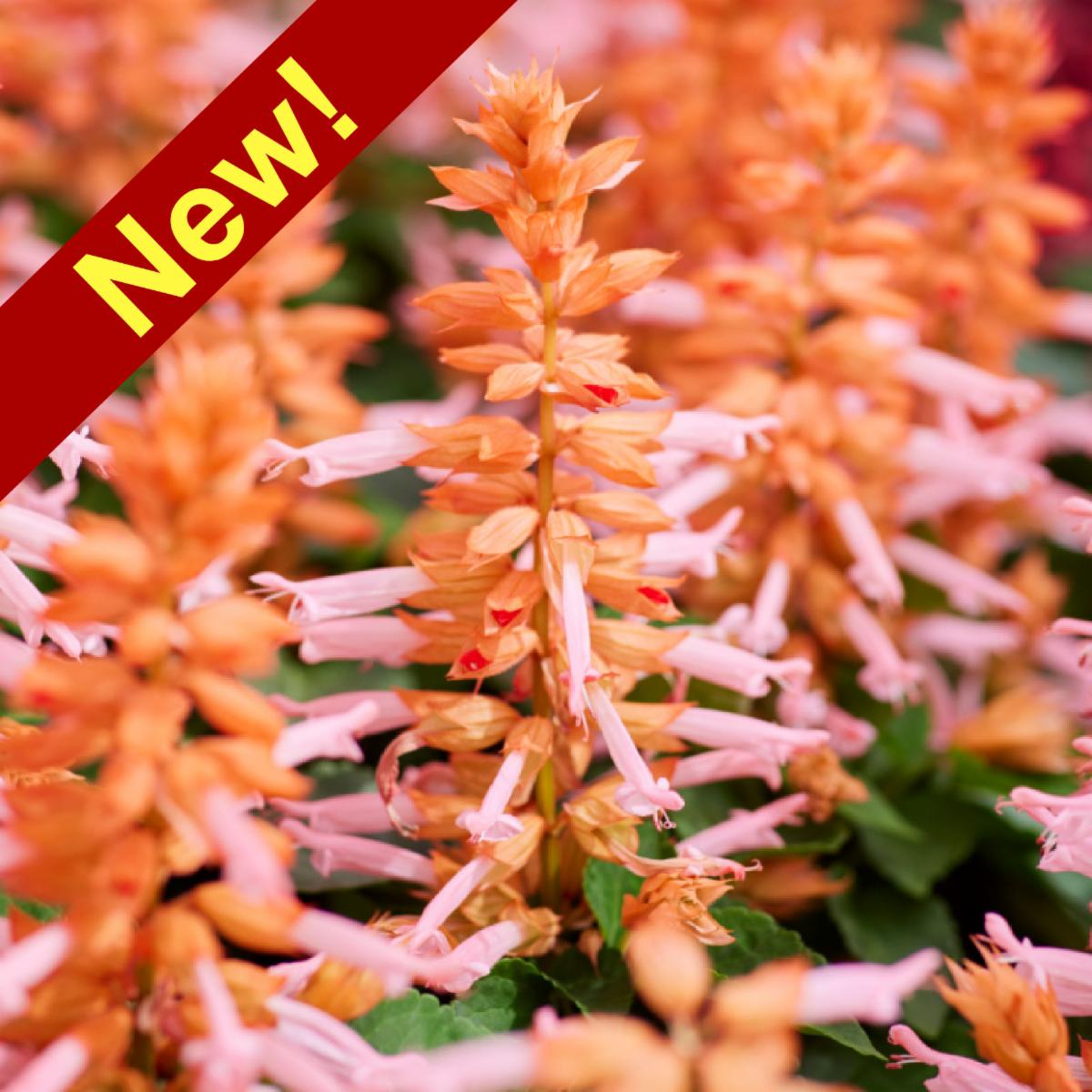 Salvia splendens. This unusual bedding Salvia flaunts dense, bicolored tubular flowers in pale pink and citrus orange that blend to a salmon effect. It's part of the new and improved Amore Series of Salvias. Annual. Height: 10" to 14".