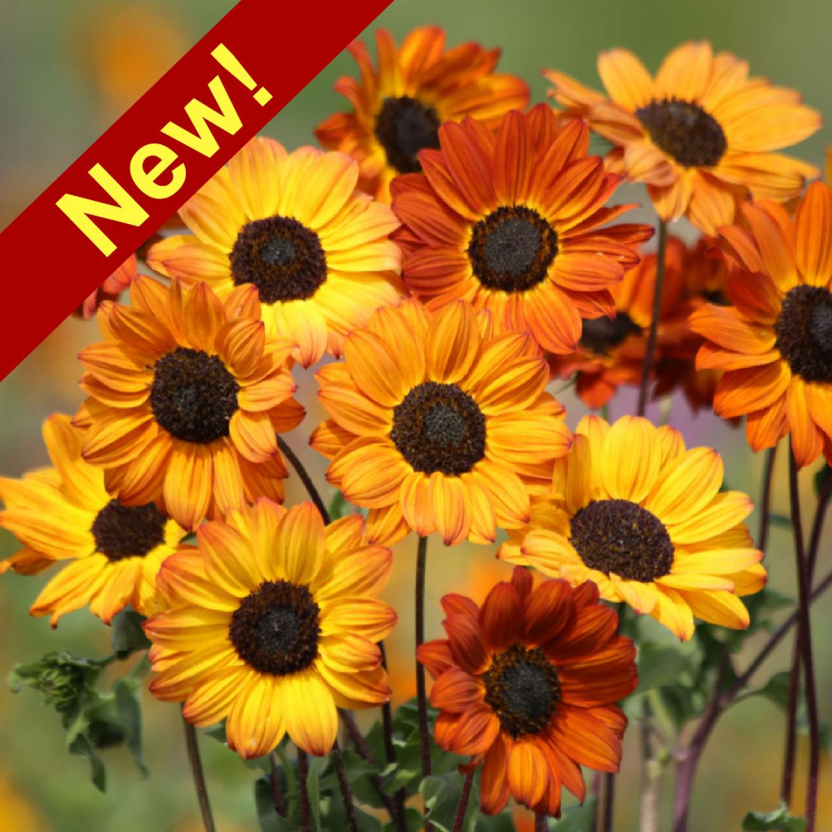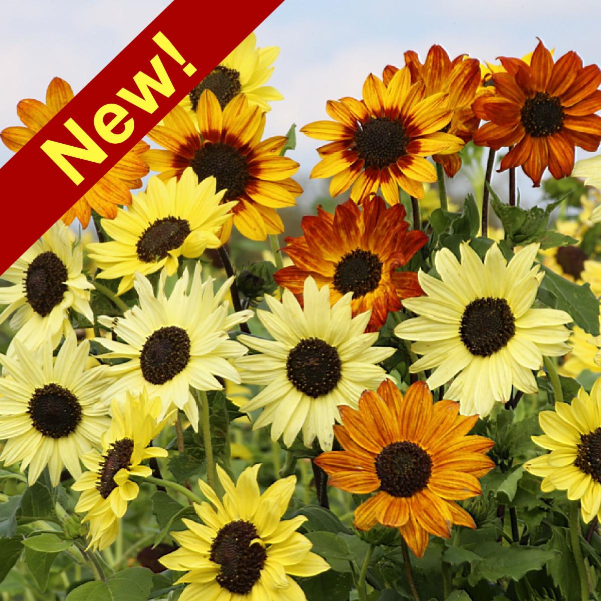 Helianthus annuus. These petite, free-flowering Sunflowers are perfect for bouquets! The 3"-wide flowers grow on chest-high, well-branched stems in shades of cream, gold, lemon and bronze with dark centers. Annual. Height: 40" to 46".