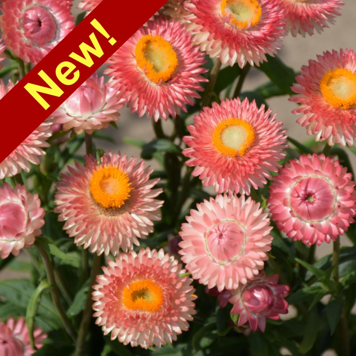 Helichrysum bracteatum. Strawflowers are great for fresh and dried bouquets--their vivid colors are retained once dried. Pick the flower heads before fully open, and wire them before drying. This new mix is luscious shades of salmon pink, from pale to vivid, with a yellow center when fully open. Gorgeous! Annual. Height: 24" to 30".