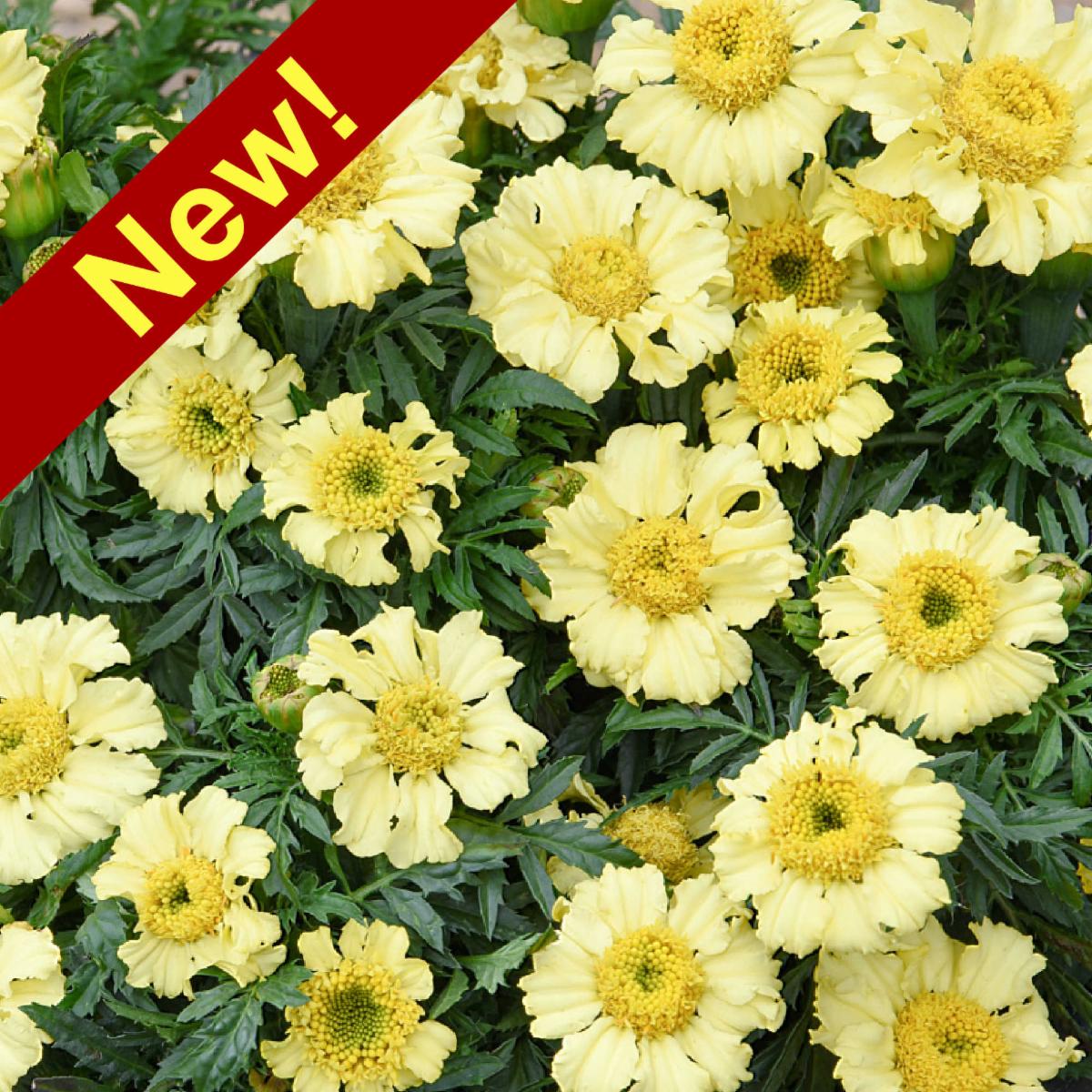 Tagetes patula. This compact, low-growing Marigold has 2"-wide, pale lemon yellow blooms with flouncy petal edges and a broad button center. It's truly unique! Annual. Height: 10".