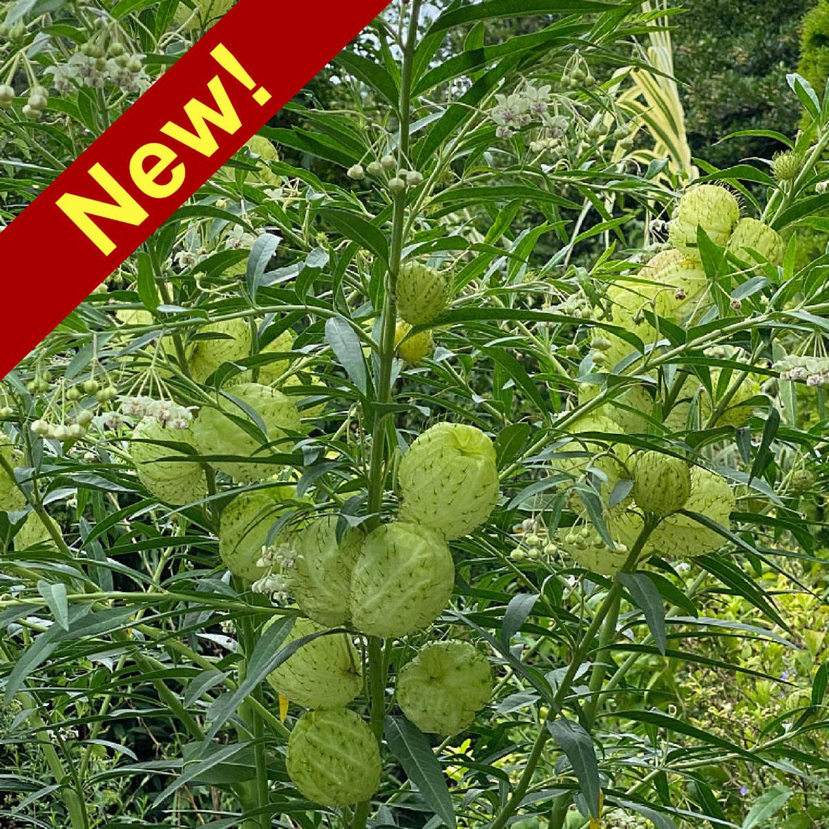 Gomphocarpus physocarpus. This South African Milkweed's straight stems of blue-green, lance-like leaves grow up to 6' tall, and its clusters of swept-back, dangling, waxy white flowers have violet accents and give way to groups of seed pods that look like hairy, lime green balloons up to 3" wide. Tender perennial. Height: 4' to 6'.