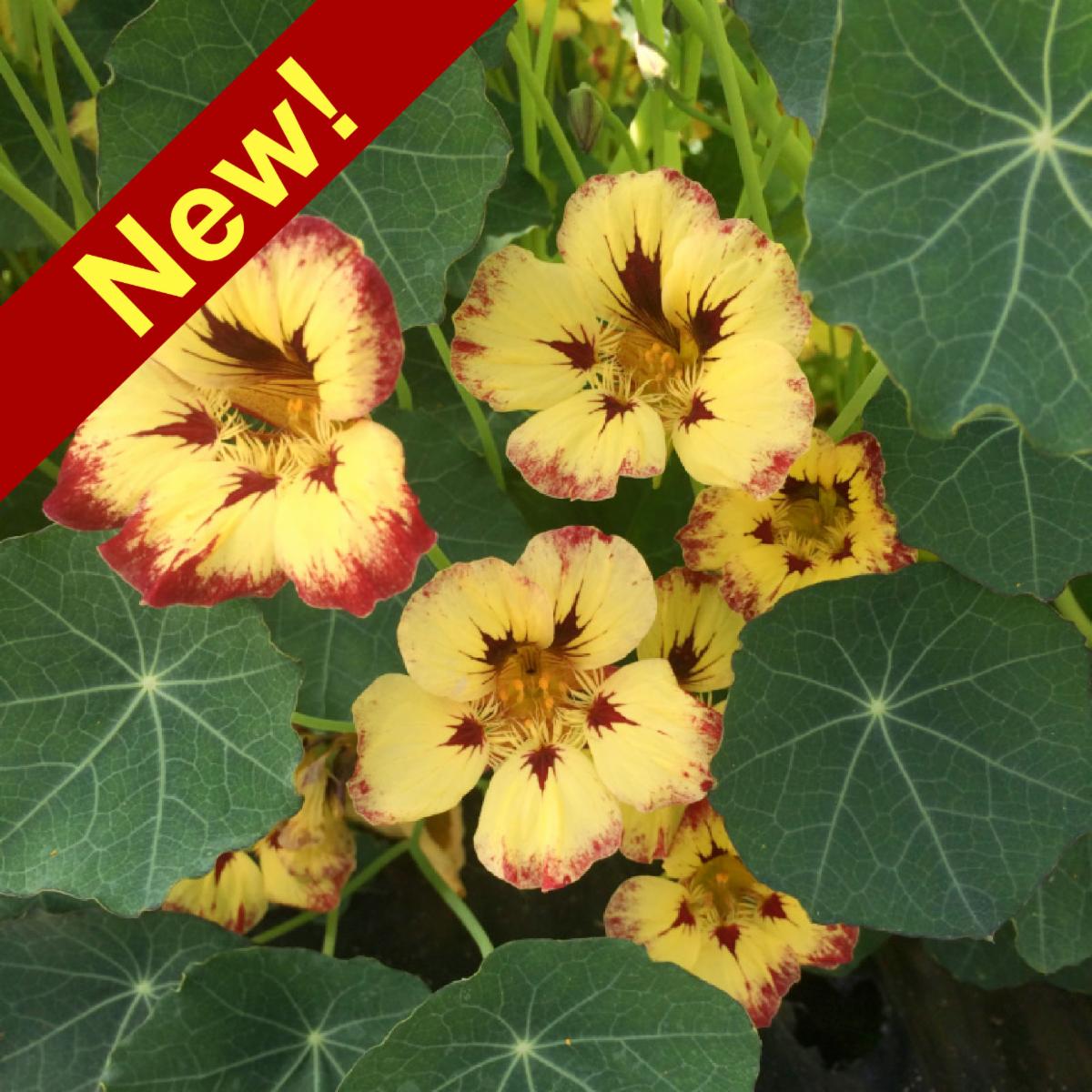 Tropaeolum majus. This tidy, compact Nasturtium is buttery yellow with cassis blotches and a subtle edging of speckled red. As with all Nasturtiums, the flowers are edible! Annual. Height: 12".