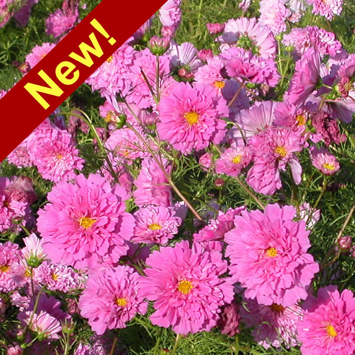 Cosmos bipinnatus. These fully double, 3"-wide Cosmos blooms are a cheerful candy-pink with a golden button center. They're just luscious in summertime bouquets! Annual. Height: 4'.