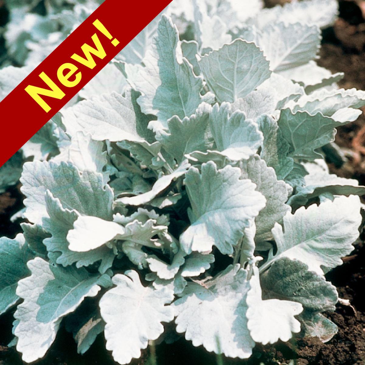 Senecio cineraria. This spectacular, mounding, silver foliage plant serves as a stunning contrast in beds, containers and bouquets. Annual. Height: 12" to 24".