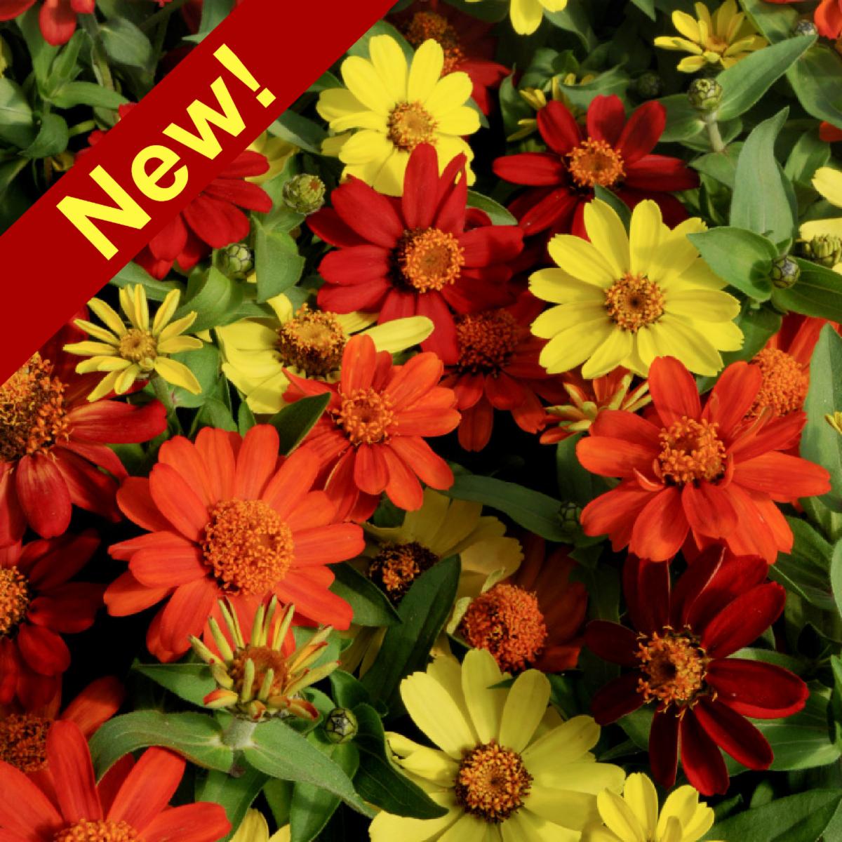 Zinnia marylandica. Continuously blooming Zahara Zinnias have large 2½" flowers atop mounds of clean, dense foliage. The Bonfire Mix sports single flowers in hot shades of red, yellow and orange. Annual. Height: 12" to 16".