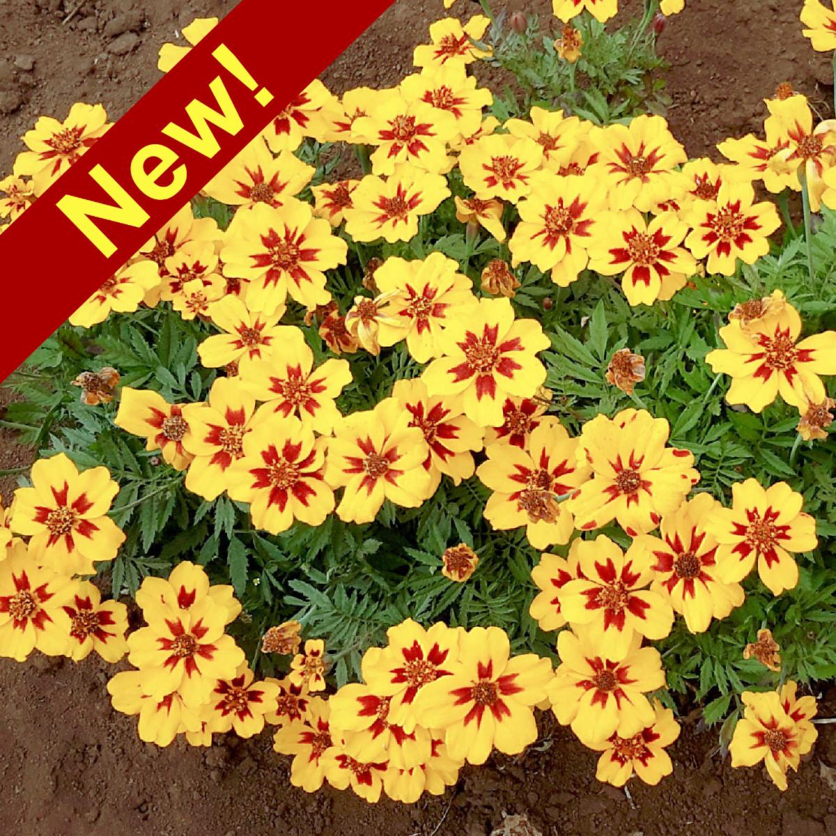 Tagetes patula. This charming heirloom Marigold is smothered in 1½" to 2", golden single flowers with a maroon blotch at each petal's base. Annual. Height 12" to 18".