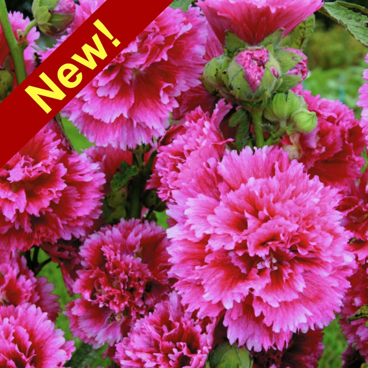 Alcea rosea. Only hip high, Fiesta Time's double, wonderfully fringed blooms are deep pink edged in the palest pink to white. Biennial. Height: 3'.