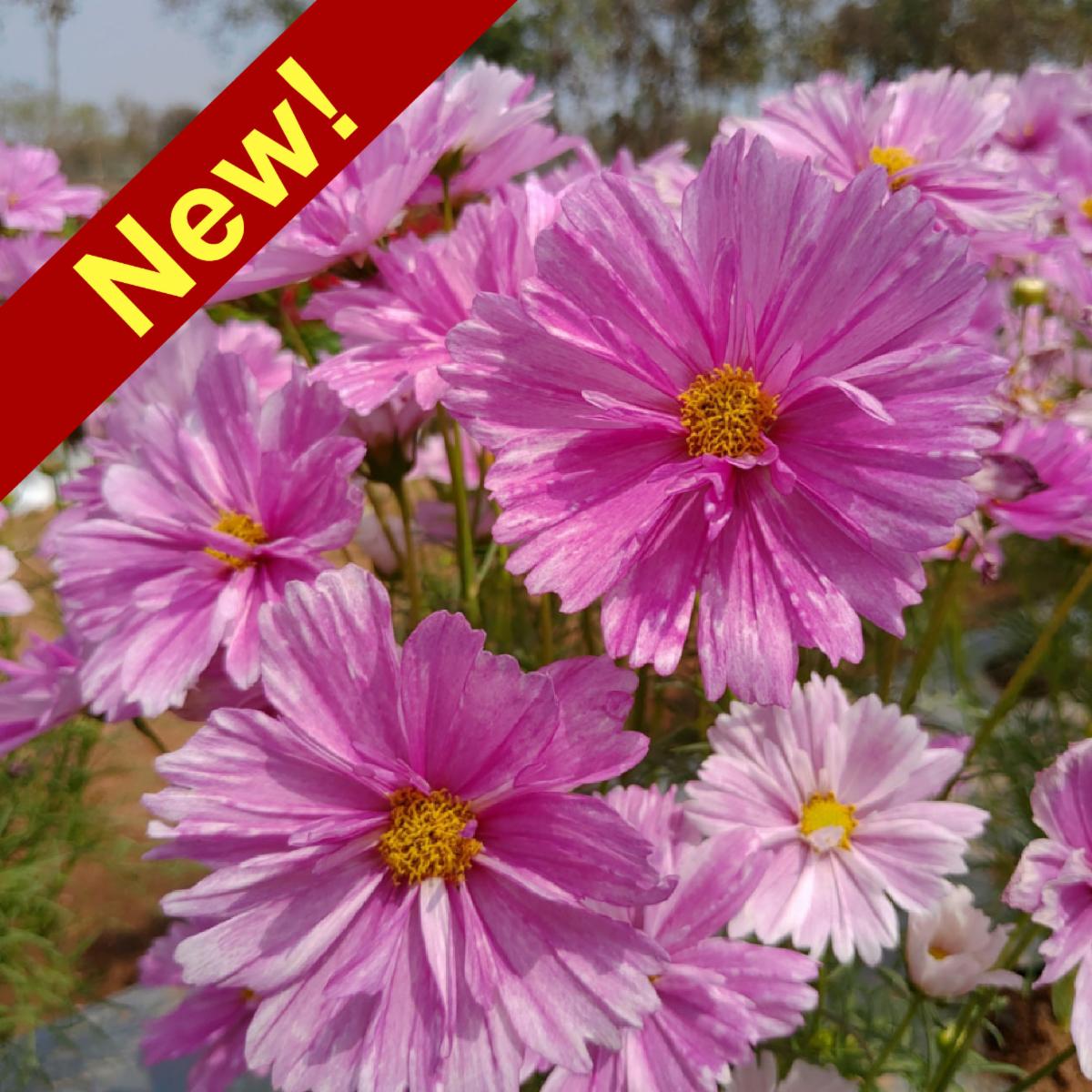 Cosmos bipinnatus. Truly unique, Pink Mosaic Cosmos has semi-double rose-pink blooms that fade to pale pink, with mottled and fragmented streaks of white. Gorgeous! Annual. Height: 3'.