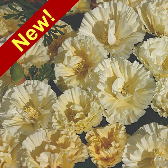 Eschscholzia californica. This dreamy, luscious California Poppy has crinkled, double blooms in shades of warm vanilla buttercream! Annual. Height: 12" to 18".