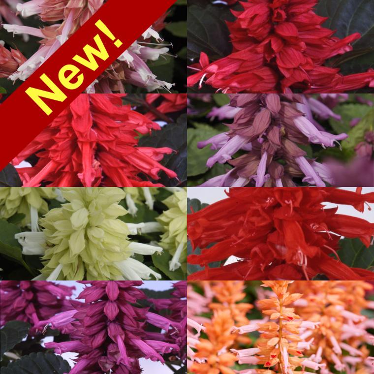 Salvia splendens. Amore is a new series of these old-fashioned bedding plants with larger, denser flower spikes and excellent quality. This is a mix of lavender, plum, purple, rose, salmon, scarlet and white. Annual. Height: 10" to 14".