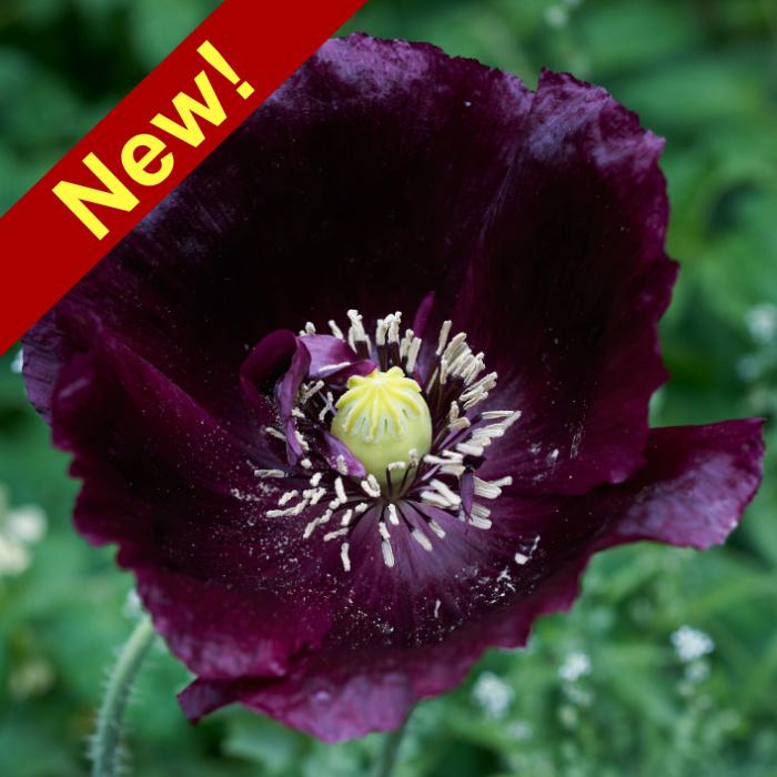 Papaver somniferum. This Poppy's single blooms are up to 4" wide and deep, velvety burgundy-purple with a ruff of pale lavender to buff anthers. Perennial. Height: 30" to 36".